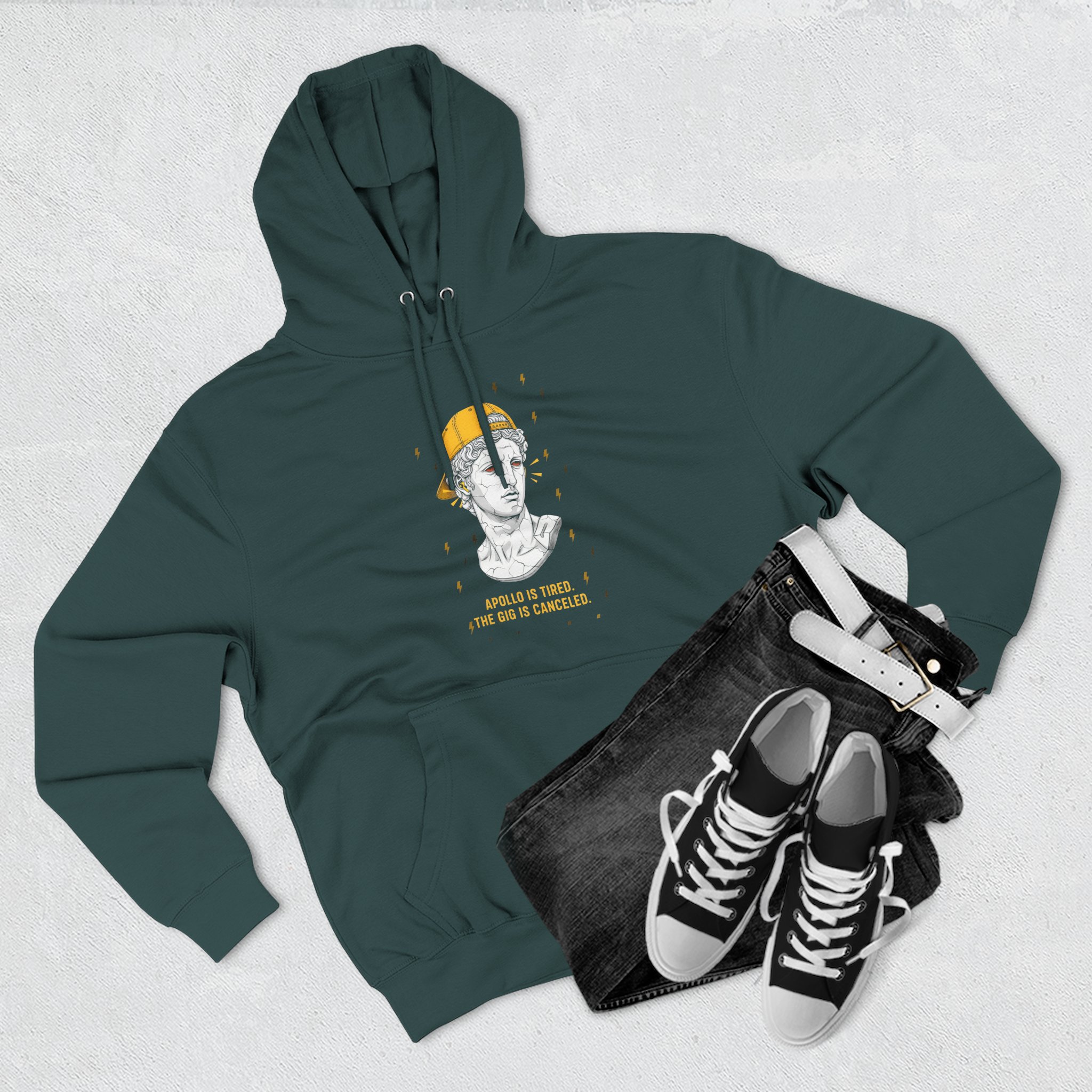 This artwork presents a striking juxtaposition of classical antiquity and modern weariness. The ancient Greek god Apollo, typically associated with light, music, and healing, is depicted as a cracked, tired bust wearing a contemporary baseball cap and earplugs, with bloodshot eyes. The phrase "APOLLO IS TIRED. THE GIG IS CANCELED." suggests a burnout or exhaustion, perhaps a commentary on the relentless pace of modern life, even for a deity. The lightning bolts in the dark background could symbolize a chaotic environment or a sudden, electrifying end to his duties. It's a humorous yet poignant reflection on the pressures and fatigue that transcend eras, even affecting the gods themselves.